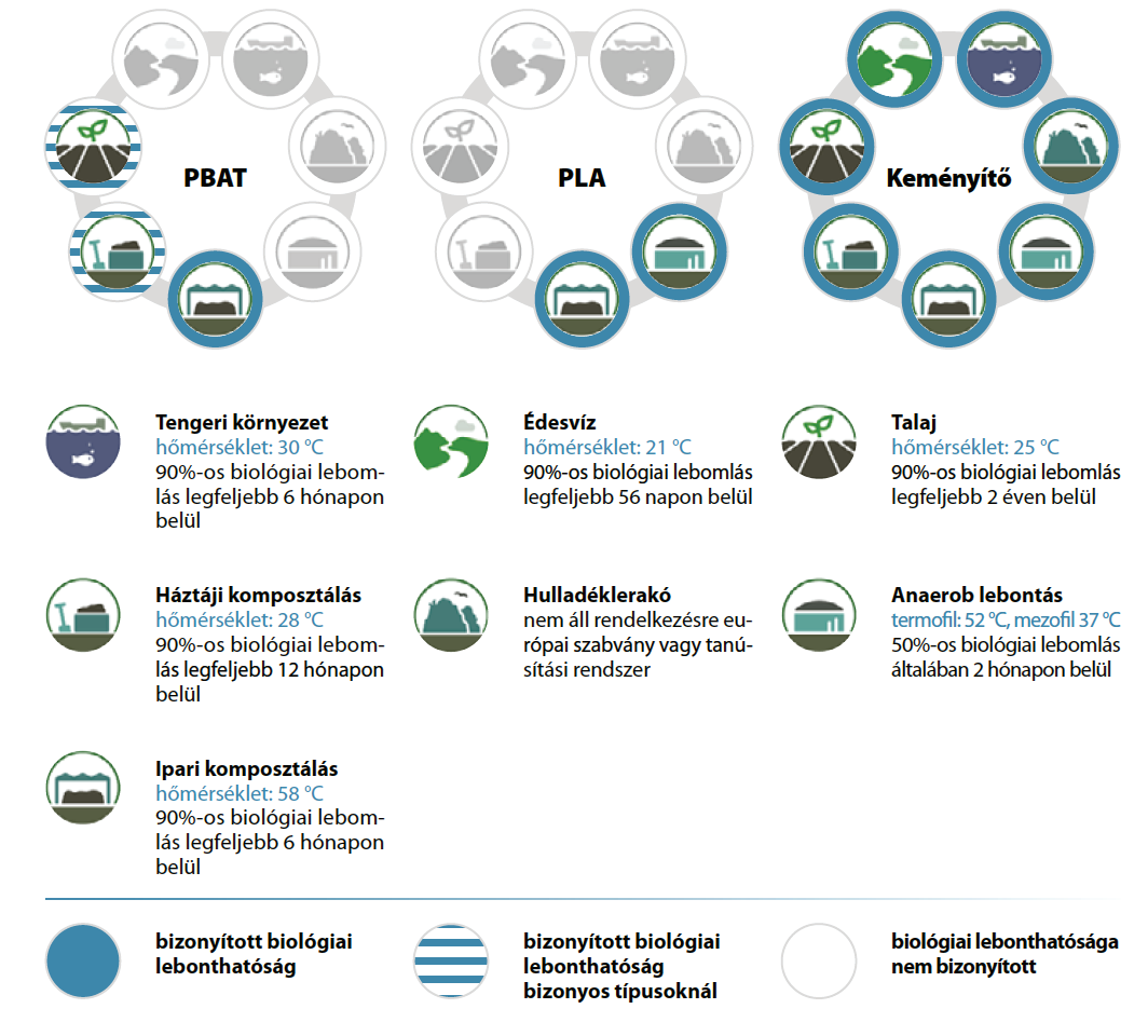 leggyorsabban komposztban megy végbe. Ezt követi a talaj, az édesvíz, a tengervíz és végül a hulladéklerakó (1. táblázat). Tehát tévhit, hogy a biopolimer hulladék magától lebomlik a környezetben, azt ugyanúgy be kell gyűjteni és kezelni kell.